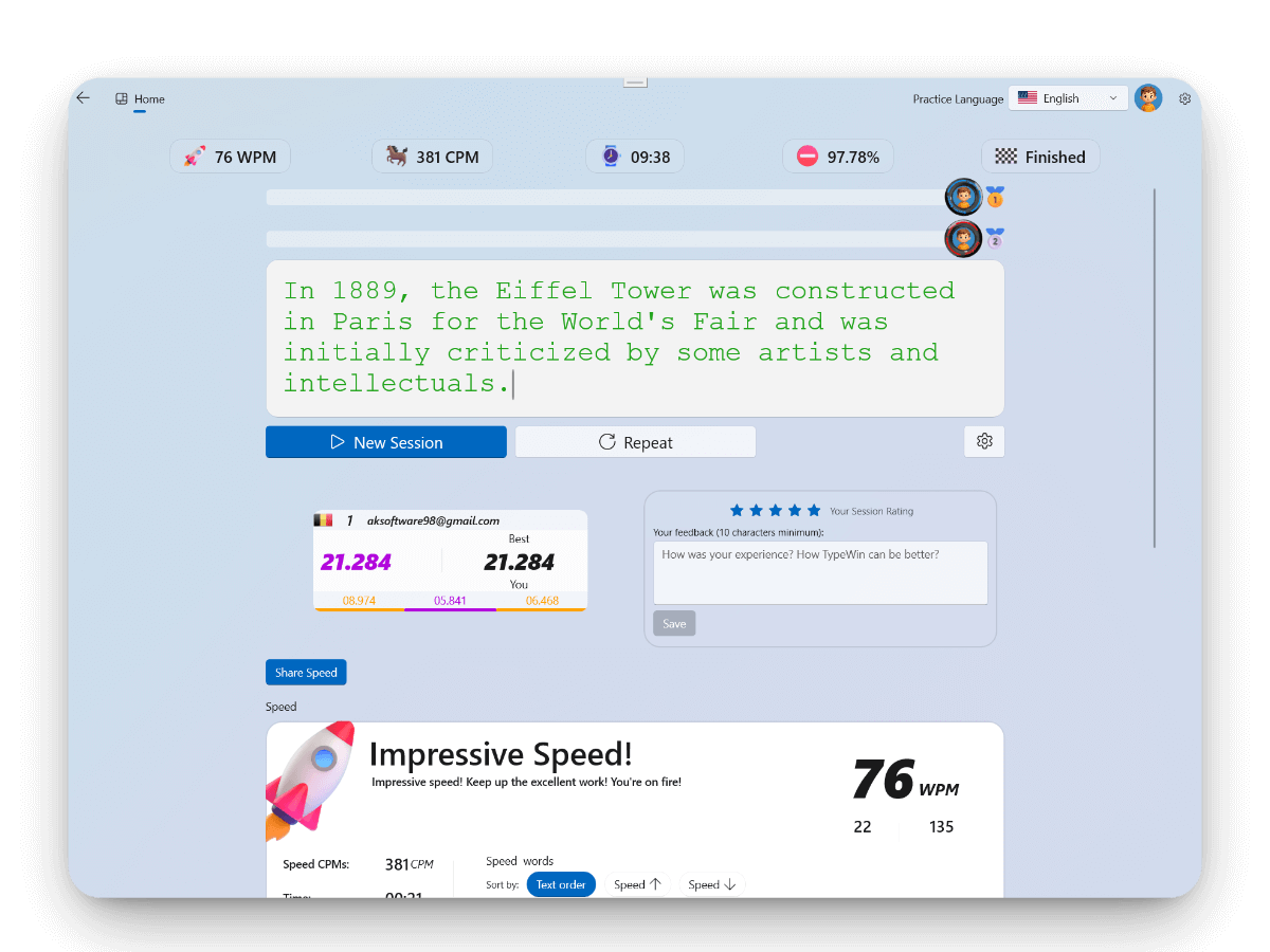 Typing 365 is the first high-performance, native Windows typing application designed to help you master speed and accuracy through zero-latency practice, advanced analytics, and competitive global leaderboards.